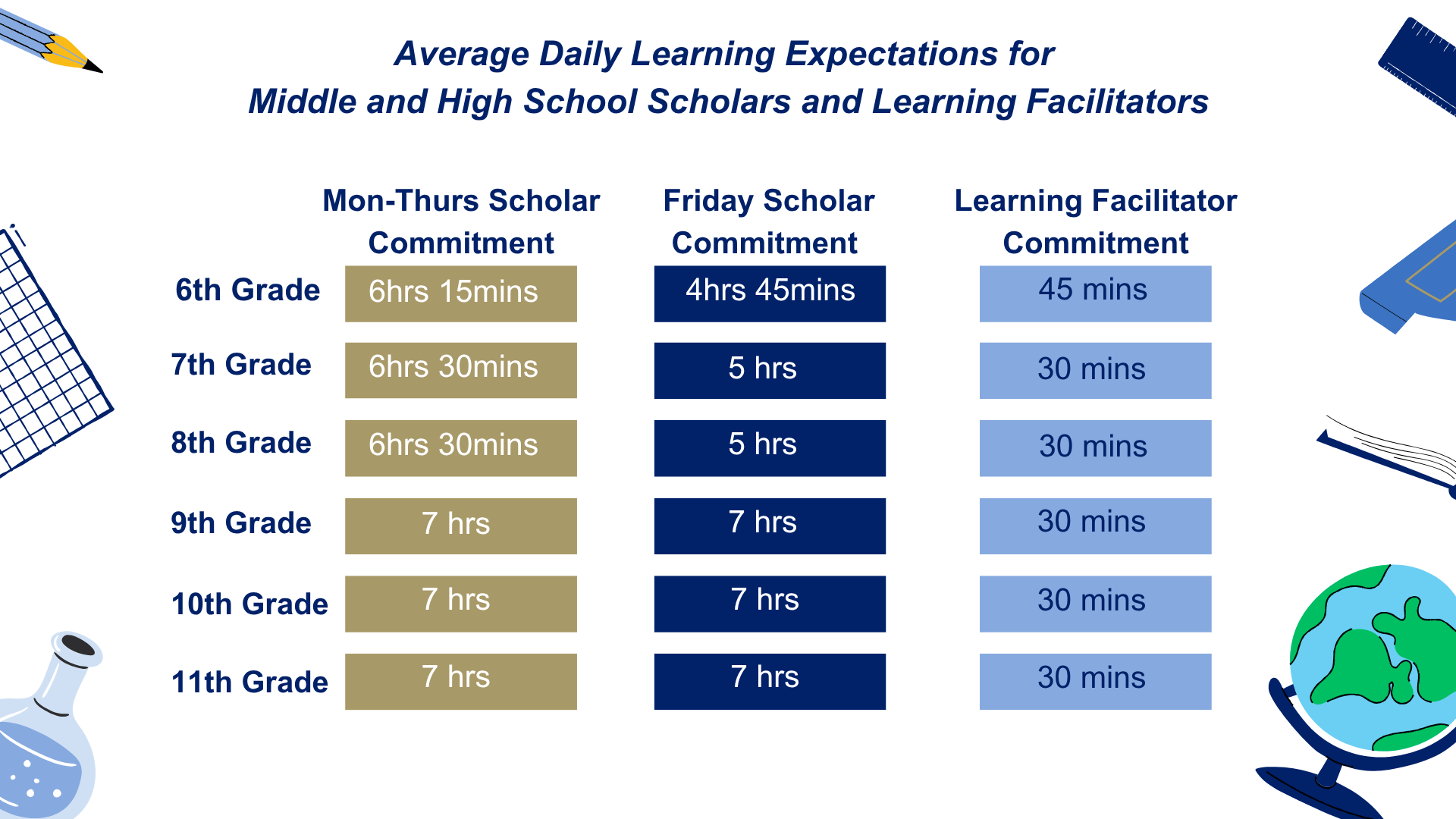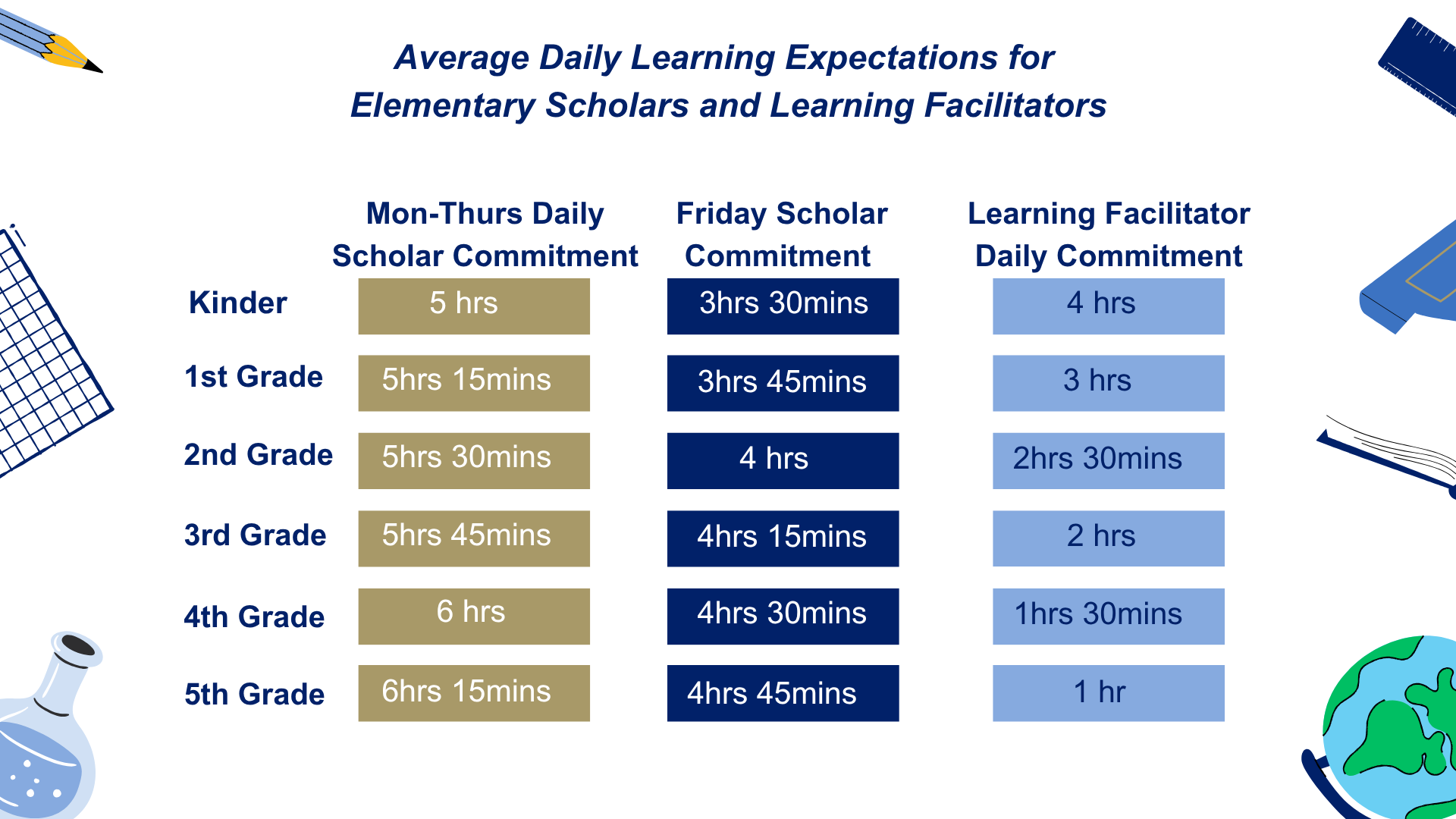 Our curriculum is rigorous and requires time and effort in order to receive the richness of a classical education. The chart below outlines the amount of time a scholar can expect to spend doing schoolwork by grade level. Learning Facilitators (guardian supporting the child in the home) should guide the student with assignment expectations, staying on task, and ensuring work is uploaded in a timely manner.